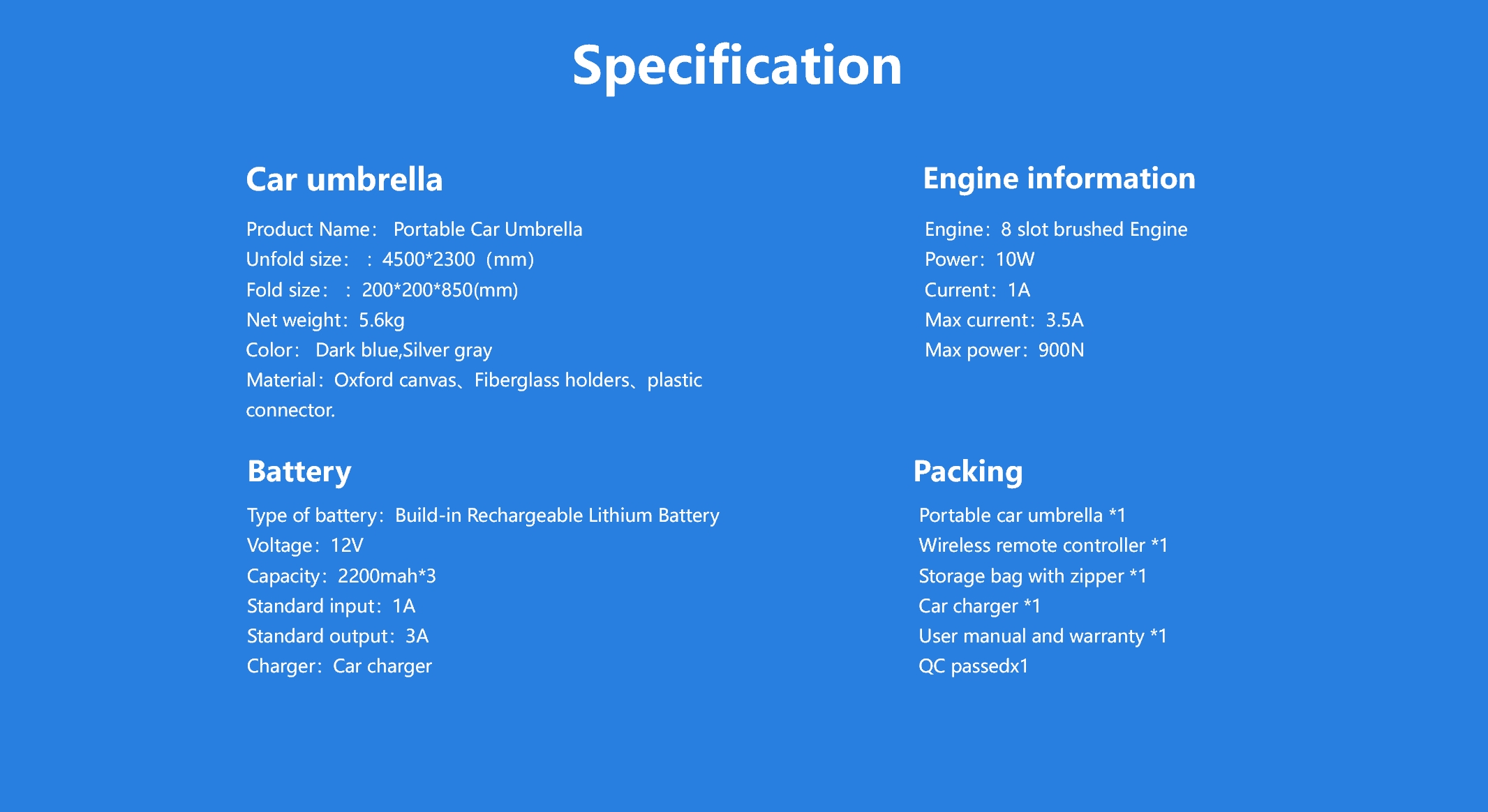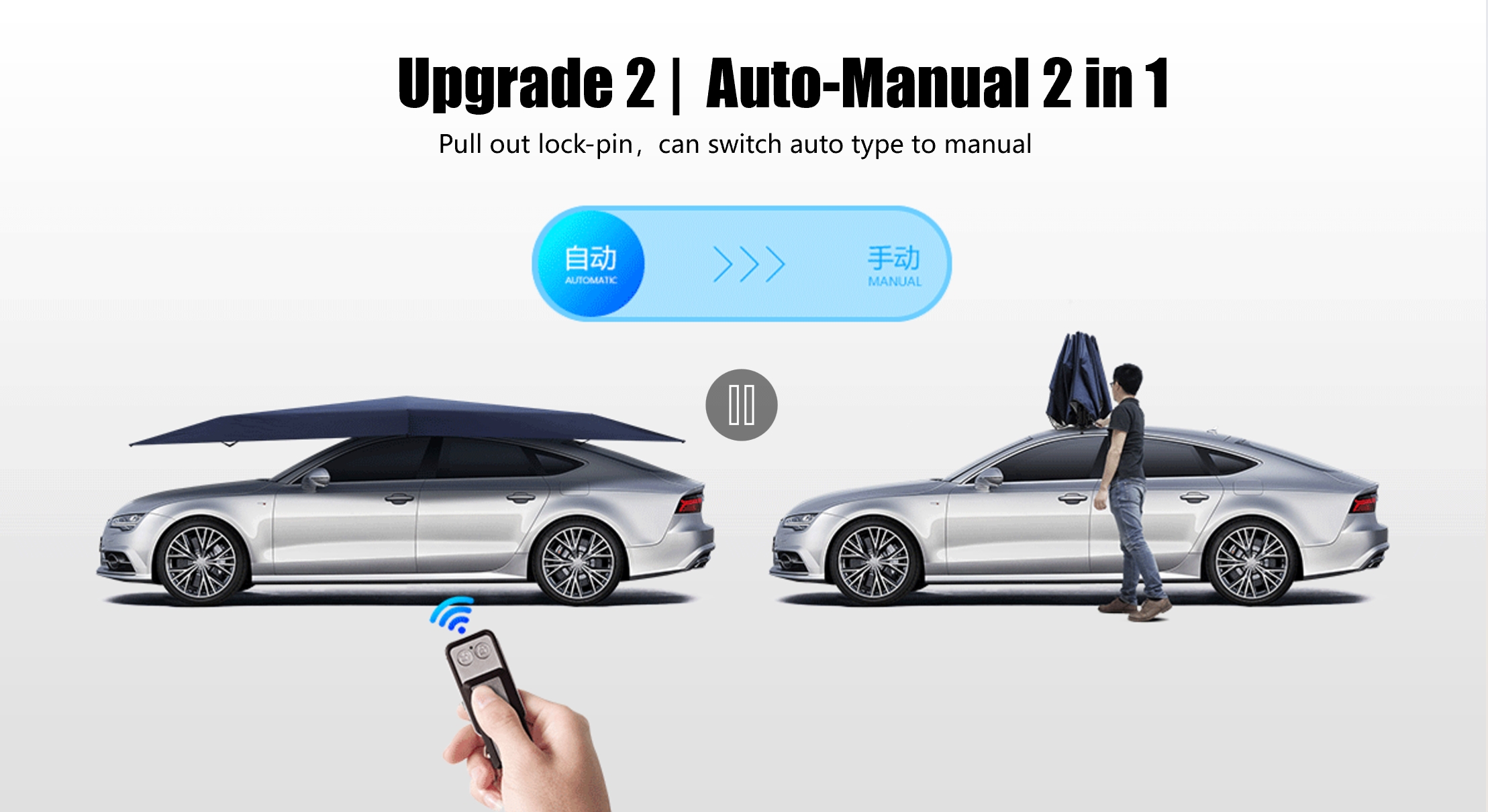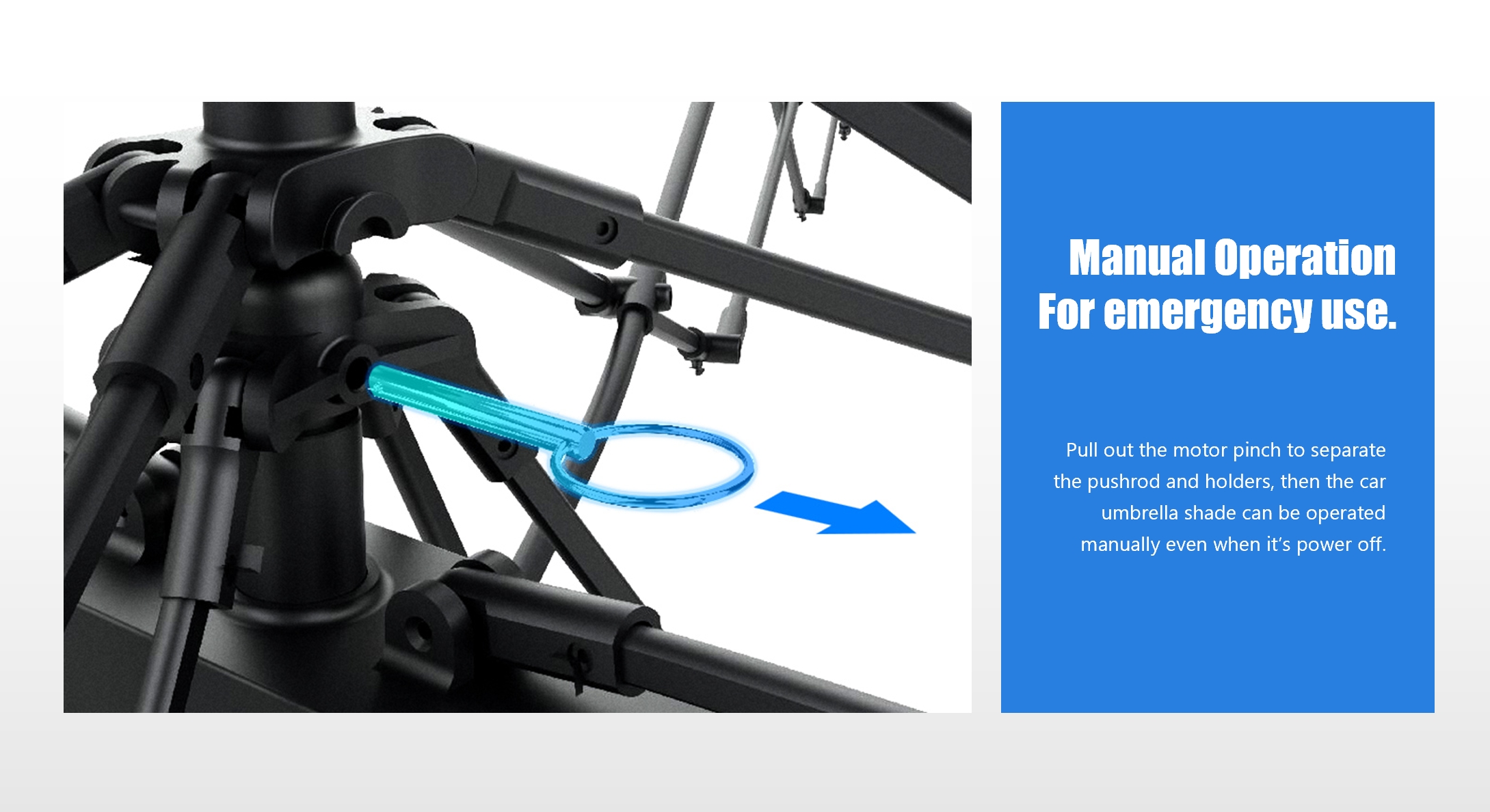 Kaukosäätimellä tapahtuvan automaattisen noston ja laskun lisäksi se voidaan vaihtaa milloin tahansa manuaaliseen tilaan eri mieltymysten mukaan. Optimoitu moottori kuluttaa vähemmän energiaa ja on akkuystävällisempi. Erityisesti suunniteltu ulkojalustarakenne varmistaa vakaamman asennuksen ja mahdollistaa nopean asennuksen ajoneuvon ulkopuolelle, mikä helpottaa tilapäisen aurinkosuojan luomista retkeilymatkoille.